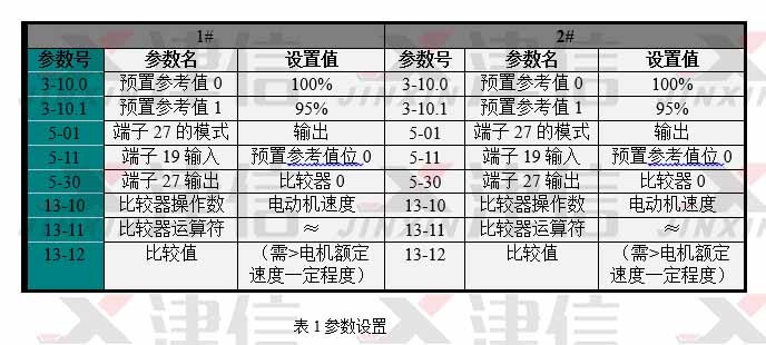 1、1#機先開機以100%速度運行,端子27接至2#機的端子19,易知此時端子27輸出高電平至2#機的端子19,2#機開機則選擇預置參考值1,以95%速度運行;
