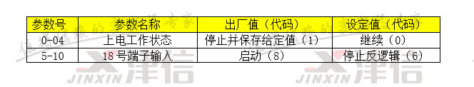 3. 通過面板按下面的參數(shù)分別在0號菜單設(shè)置上電工作狀態(tài),5號菜單設(shè)置18號端子輸入值。