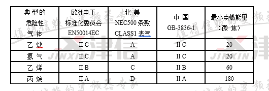 注:中國GB3836標準規(guī)定ⅡC級最小點燃能量為19微焦耳,ⅡA級最小點燃能量為200微焦耳。