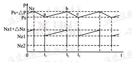 圖1給出了λ = 0.7,Q0 = 10Q1時(shí)空壓機(jī)的功耗和壓力變化關(guān)系趨勢圖。式中Q0為空壓機(jī)配套的儲(chǔ)氣罐容積,ps為滿足用戶需要的最低壓力,Nz1為空壓機(jī)供氣壓力在 ps時(shí)恒速運(yùn)行的功耗,psp為空壓機(jī)運(yùn)行的最高壓力,其中Δp為壓力控制器的差動(dòng)壓力,Nz1+ΔNz為空壓機(jī)在供氣壓力為psp時(shí)的功耗,Nz2 為空壓機(jī)在空載時(shí)恒速運(yùn)行的功耗。從圖1中可以看到,當(dāng)壓力由a點(diǎn)上升到b點(diǎn),空壓機(jī)的功耗由Nz1上升到Nz1+ΔNz,顯然空壓機(jī)功耗的增加是由于Q2和Q1不相等造成供氣壓力上升所造成的,這可以從公式Nz=Mτ×n/973.2得到證明,式中Nz表示空壓機(jī)軸功率,Mτ表示空壓機(jī)轉(zhuǎn)矩,n表示空壓機(jī)轉(zhuǎn)速。當(dāng)壓力上升時(shí) , 由于轉(zhuǎn)矩和 壓力成正比關(guān)系 , 空壓機(jī)轉(zhuǎn)矩也隨之上升 , 從而導(dǎo)致 空壓機(jī)軸功率上升 ; 當(dāng)壓力上升到b點(diǎn)后,壓力控制 器觸發(fā)電磁閥關(guān)閉空壓機(jī)進(jìn)氣,這時(shí)空壓機(jī)進(jìn)入空載狀態(tài)運(yùn)行,其功耗為Nz2 ,同時(shí)供氣壓力也開始下降,在供氣壓力下降到C點(diǎn)之前,空壓機(jī)一直維持在功耗為Nz2的空載運(yùn)行狀態(tài);當(dāng)壓力下降到C點(diǎn)后,壓力控制器觸發(fā)電磁閥打開空壓機(jī)進(jìn)氣,空壓機(jī)重新進(jìn)入壓力上升階段,如此循環(huán)往復(fù)。