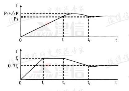目前,變頻螺桿空壓機(jī)的運(yùn)行頻率大多是由變頻器根據(jù)用戶設(shè)定的期望壓力和供氣端反饋的實(shí)時(shí)壓力的差值進(jìn)行自動(dòng)調(diào)節(jié)。當(dāng)供氣端反饋的實(shí)時(shí)壓力超過用戶設(shè)定的期望壓力時(shí),變頻器減小輸出頻率,反之,則增大輸出頻率;而當(dāng)供氣端反饋的實(shí)時(shí)壓力等于用戶設(shè)定的期望壓力時(shí),變頻器維持當(dāng)前輸出頻率。圖3給出了λ = 0.7,Q0 = 10Q1 時(shí)變頻螺桿空壓機(jī)的供氣壓力和變頻器輸出頻率變化關(guān)系趨勢圖。從圖3中可以看到, 變頻螺桿空壓機(jī)起動(dòng)后其輸出頻率平穩(wěn)上升至額定頻率fe(軟起動(dòng)方式,起動(dòng)時(shí)間t0可調(diào)),然后維持額定頻率運(yùn)行,供氣壓力也隨之上升,當(dāng)壓力上升到用戶設(shè)定的期望壓力ps時(shí)(t1),空壓機(jī)輸出頻率開始下降,由于慣性壓力還會(huì)有一點(diǎn)超調(diào)量Δp,通常 Δp<5%ps。隨著輸出頻率繼續(xù)下降,空壓機(jī)的供氣量也隨之下降,供氣壓力最終降至期望壓力ps處,這時(shí)輸出頻率也維持相對穩(wěn)定狀態(tài)。在變頻螺桿空壓機(jī)的運(yùn)行中,一旦出現(xiàn)供氣量發(fā)生變化導(dǎo)致供氣壓力變化時(shí),變頻器會(huì)立即調(diào)節(jié)輸出頻率使供氣壓力維持在ps處??傊?,對于變頻螺桿空壓機(jī)來說,除非它的供氣量是絕對不變的,否則其運(yùn)行過程就是一個(gè)動(dòng)態(tài)平衡過程,就是系統(tǒng)的輸出頻率在上限和下限頻率之間不斷地變化以尋求氣量供需平衡的過程。