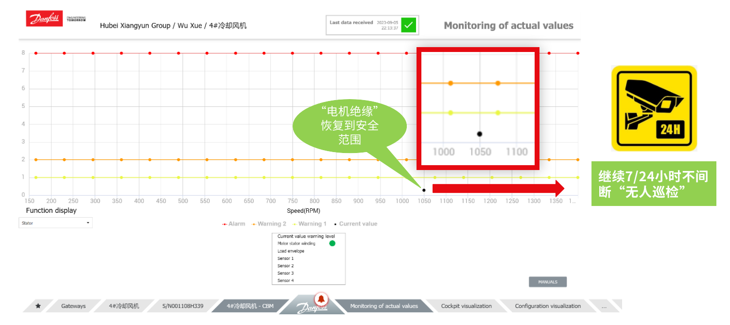 改造方案的目的是讓現(xiàn)場(chǎng)技術(shù)人員能夠?qū)ο到y(tǒng)進(jìn)行實(shí)時(shí)監(jiān)控,同時(shí)可以提前預(yù)警,防止非計(jì)劃停機(jī)。祥云化工最終同丹佛斯達(dá)成一致,合作開發(fā)數(shù)字化解決方案,增加丹管家+CBM(電機(jī)繞組絕緣,電機(jī)負(fù)載包絡(luò)),并于2021年年底正式上線。