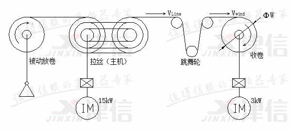 水箱拉絲機是子午線輪胎用鋼簾線生產企業(yè)的關鍵設備,其收卷控制是變頻器跳舞輪位置反饋控制。由于生產速度快,用量大,加上環(huán)境比較惡劣,因此要求采用性能優(yōu)異,穩(wěn)定性好,質量可靠和抗腐蝕能力強的變頻器。我廠為拉拔0.22毫米以下線徑的鋼簾線定制了160型新型水箱拉絲機上,全部選用了丹佛斯最新推出的FC系列變頻器作收卷和主傳動驅動,取得了很好的運行效果。