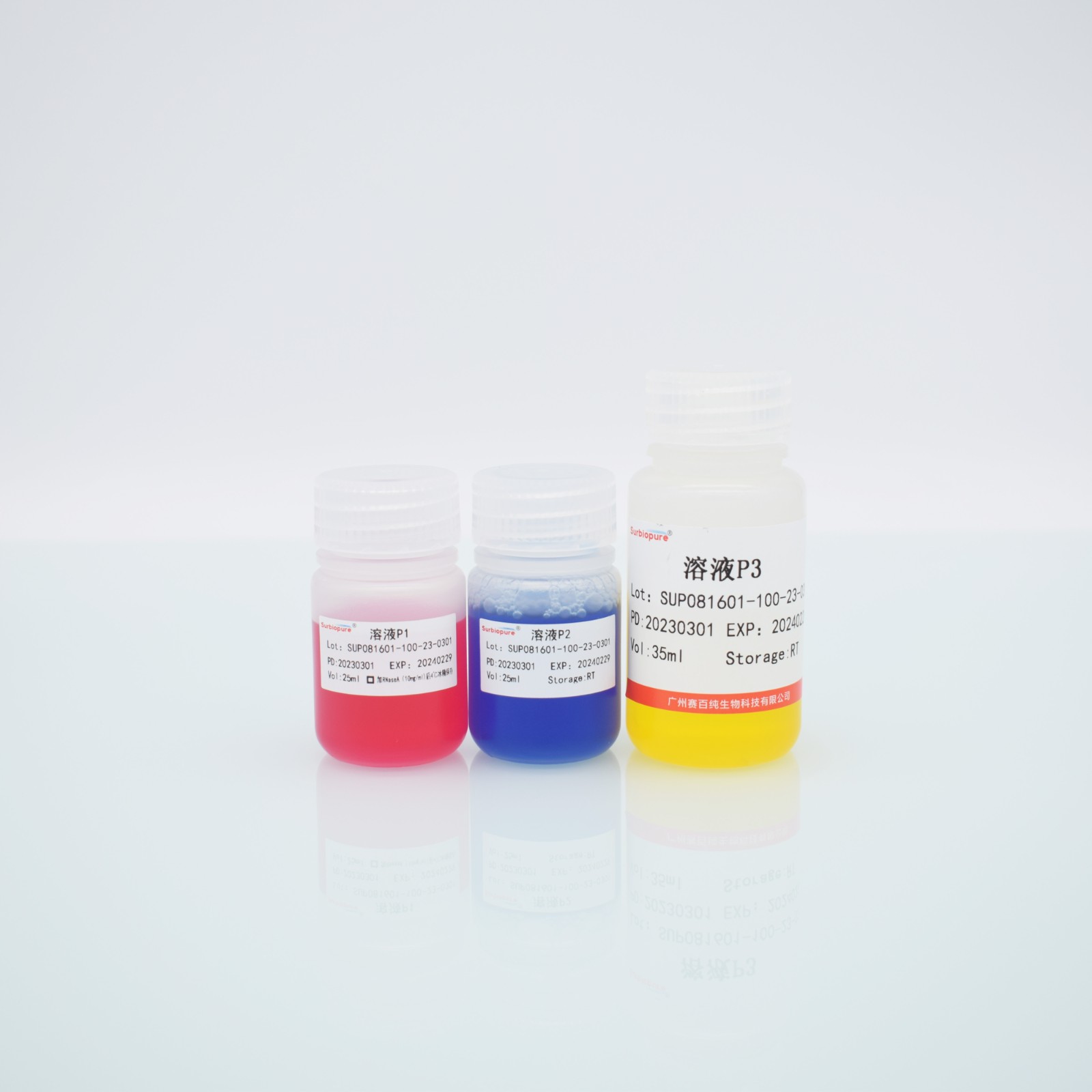 獨特的菌裂解Buffer系統,P1淺紅色、P2藍色、P3黃色