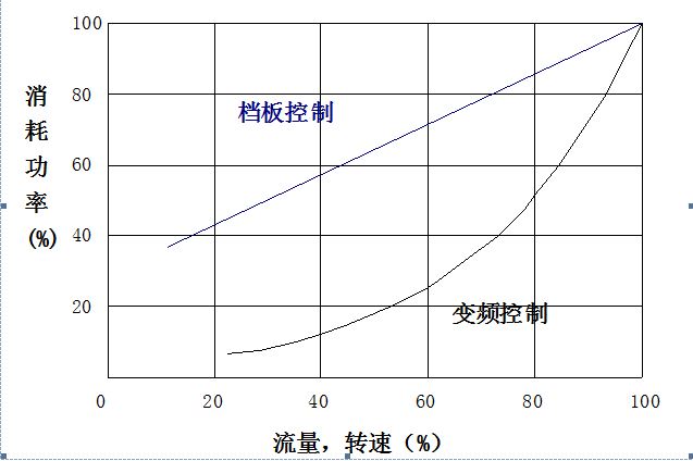 交流驅(qū)動(dòng)系統(tǒng)實(shí)際使用時(shí),可通過(guò)實(shí)測(cè)或根據(jù)其靜態(tài)特性的理論計(jì)算,作出其轉(zhuǎn)速對(duì)功率的特性曲線,由于轉(zhuǎn)速與流量成正比,該曲線即流量對(duì)功率的特性,如圖1所示。與檔板調(diào)節(jié)相比較,可見(jiàn)其節(jié)能是顯著的。