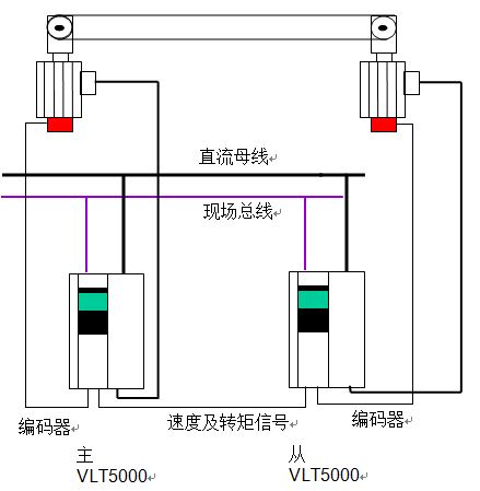 變頻器由共用直流母線供電, 丹佛斯可提供整流/回饋裝置或由用戶提供. 各分部速度可由現(xiàn)場總線提供, 也可由變頻器本身形成速度鏈. 變頻器采用速度閉環(huán)控制. 從變頻器的速度參考值由主變頻器給定. 同時主變頻器提供給從變頻器轉(zhuǎn)矩信號. 從變頻器根據(jù)其轉(zhuǎn)矩與主變頻器的差別, 動態(tài)修正從變頻器的轉(zhuǎn)速, 從而保證兩個變頻器出力一致. 所有運算通過可自由編程的工藝控制卡實現(xiàn).