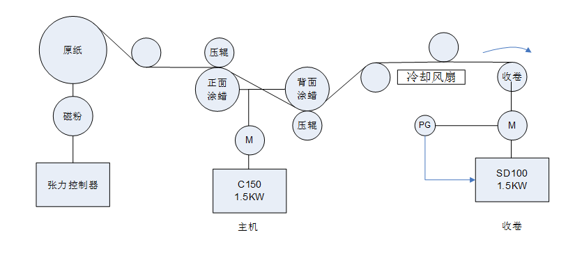 整機(jī)以涂蠟部位作為主機(jī),收卷采用錐度張力收卷,整機(jī)速度在150-200 m/min運行。