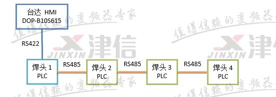 HMI和焊頭1的PLC之間采用三菱支持的RS422通訊,通訊速率可達(dá)115200bps。焊頭1的PLC和其它三個焊頭的PLC之間采用三菱PLC支持的N:N網(wǎng)絡(luò),通訊速率最高為19200bps。